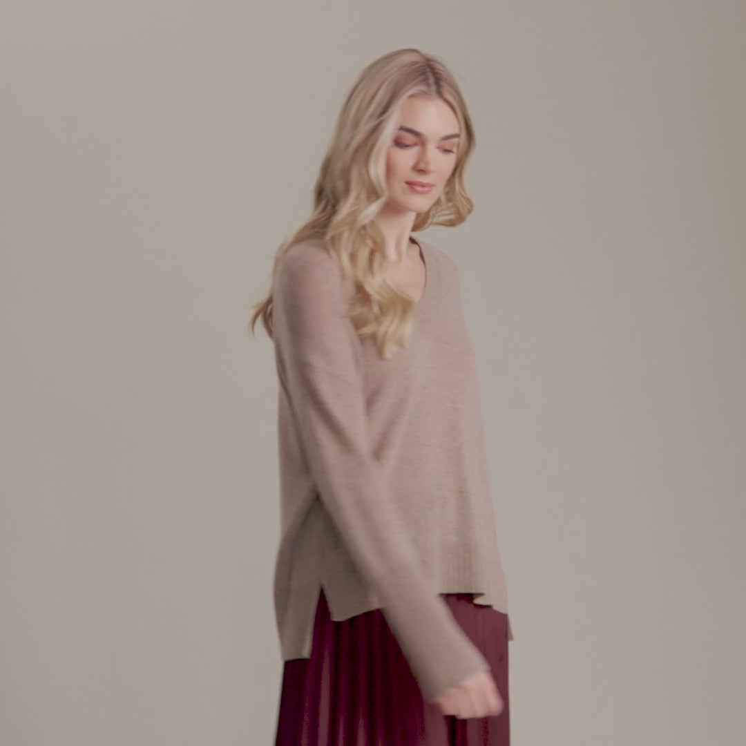 Luxuriously soft, effortlessly stylish, the Devin High-Low Cashmere V-Neck Sweater is a must-have for the modern woman who values both comfort and individuality. Available in a stunning Natural color and/or a custom color of your choice.