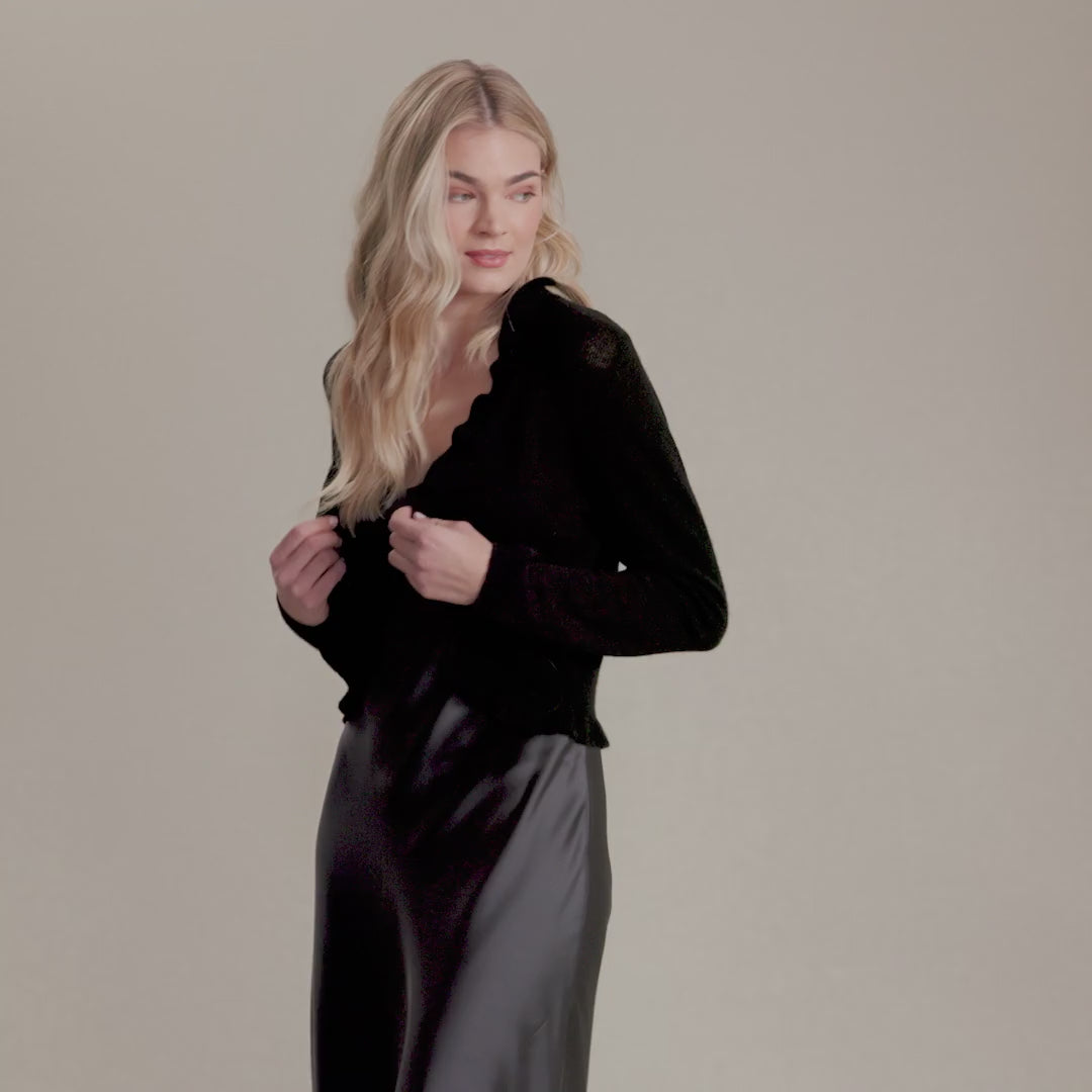 Woven from pure, 100% cashmere, the Divine Ruffle Edge Bolero Cardigan offers unparalleled softness and lightweight warmth. The 2ply 7gg knit creates a luxurious feel, perfect for draping over a dress or adding a touch of elegance to a casual outfit.